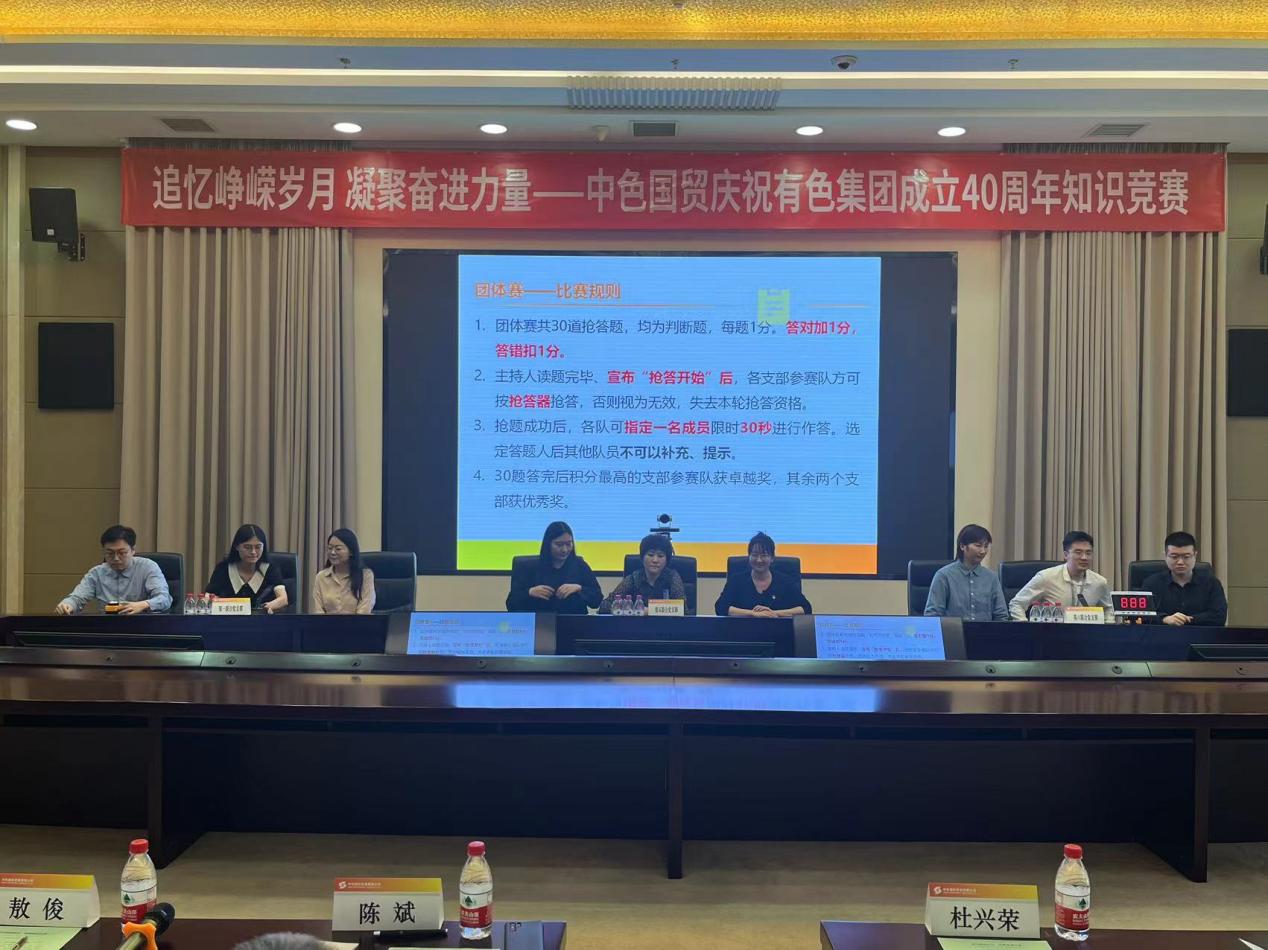 ??????9月27日,為慶祝集團(tuán)公司成立40周年,結(jié)合深入開展學(xué)習(xí)貫徹習(xí)近平新時(shí)代中國特色社會(huì)主義思想主題教育,中國有色集團(tuán)出資企業(yè)中色國際貿(mào)易有限公司(簡稱:中色國貿(mào))舉行“追憶崢嶸歲月、凝聚奮進(jìn)力量”主題知識競賽活動(dòng),通過組織黨建知識、集團(tuán)歷史、公司歷史競賽,夯實(shí)堅(jiān)定擁護(hù)“兩個(gè)確立”、堅(jiān)決做到“兩個(gè)維護(hù)”的思想根基,追憶集團(tuán)公司四十年櫛風(fēng)沐雨、篳路藍(lán)縷的創(chuàng)業(yè)歷程,樹牢公司黨員新時(shí)代積極上進(jìn)、實(shí)干興企的干事意識。