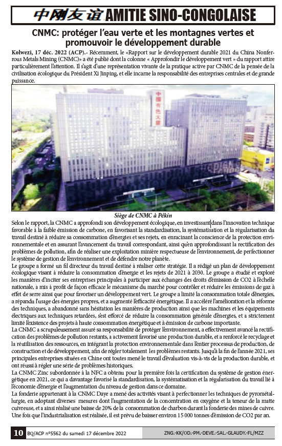 剛通社是中南部非洲最具權(quán)威主流媒體之一,創(chuàng)辦有《中剛友誼》專欄。這是在繼2021年5月五連載發(fā)布《中國有色集團(tuán)剛果(金)可持續(xù)發(fā)展報告》之后,再一次全媒體集中宣傳推介中國有色集團(tuán),形成了良好的國際輿論環(huán)境。? ? ?
